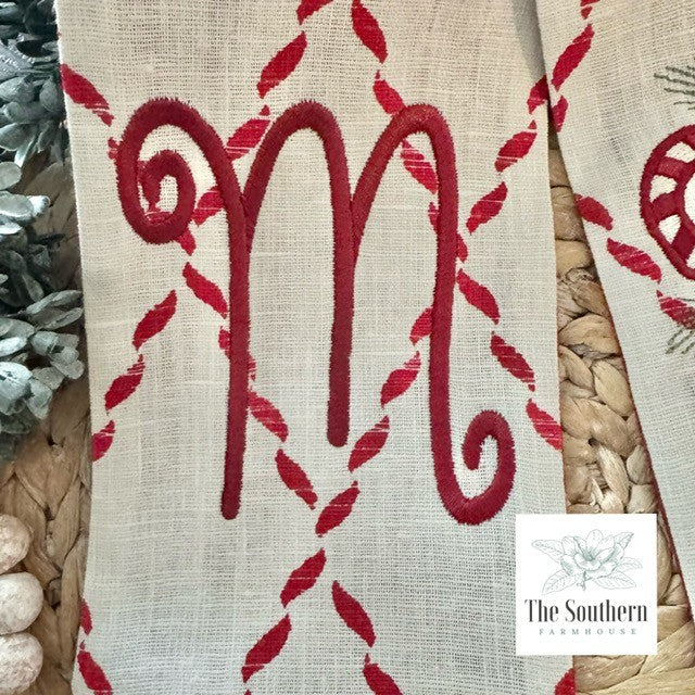 This festive sash is crafted with two gorgeous heavyweight linens. The front features a cream background with scarlet red twist. We've embroidered an adorable candy cane design by Shuler Studio and complimentary single initial on the other tail. The back of the sash is solid scarlet red This beauty adds a whimsical touch to your Christmas and holiday decorating.