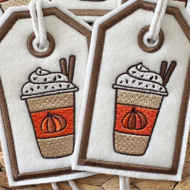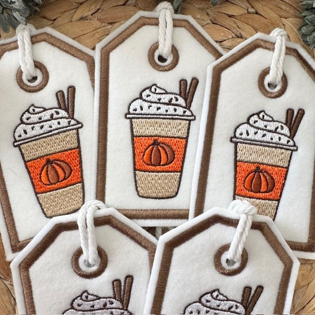 The cutest pumpkin spice latte embroidered gift tags for your coffee loving friends!